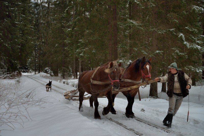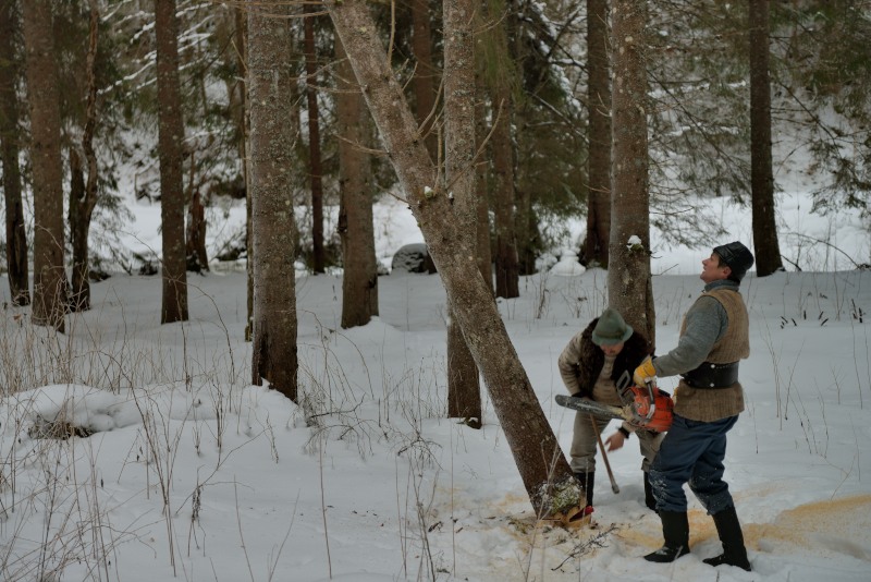 2日目です。きこりによる木の伐採、馬による運搬、人力による貨車への積込作業を撮影し