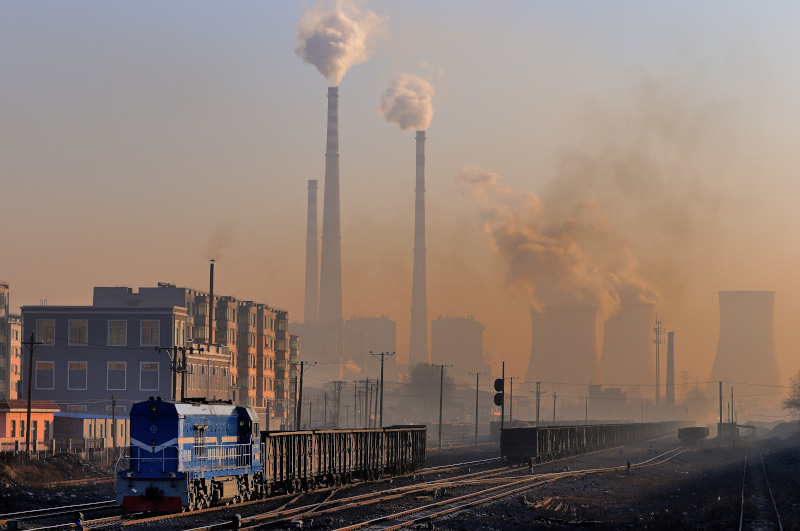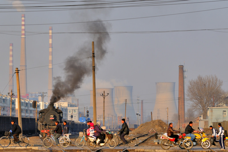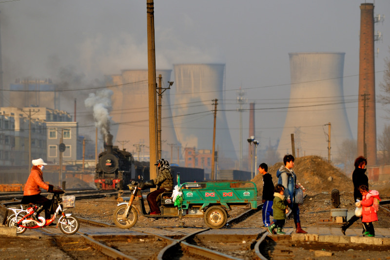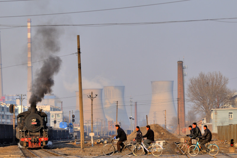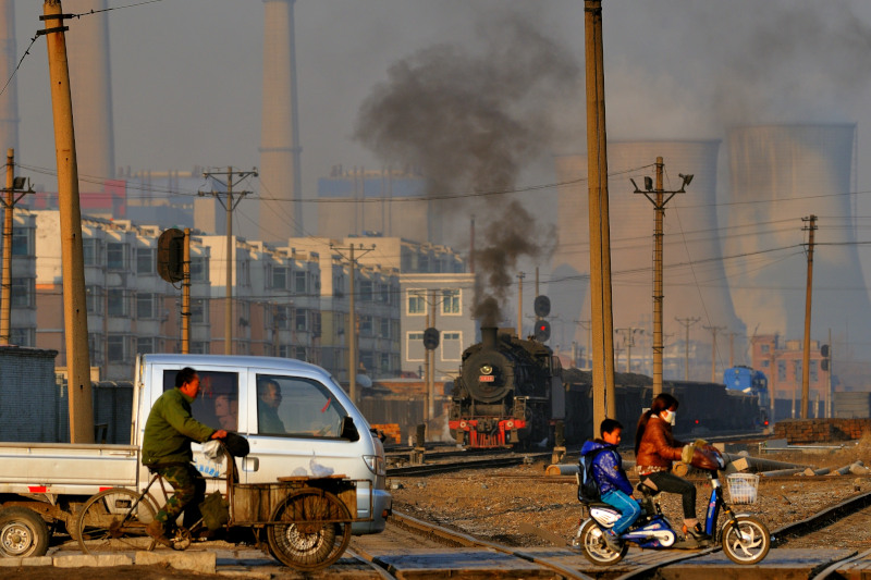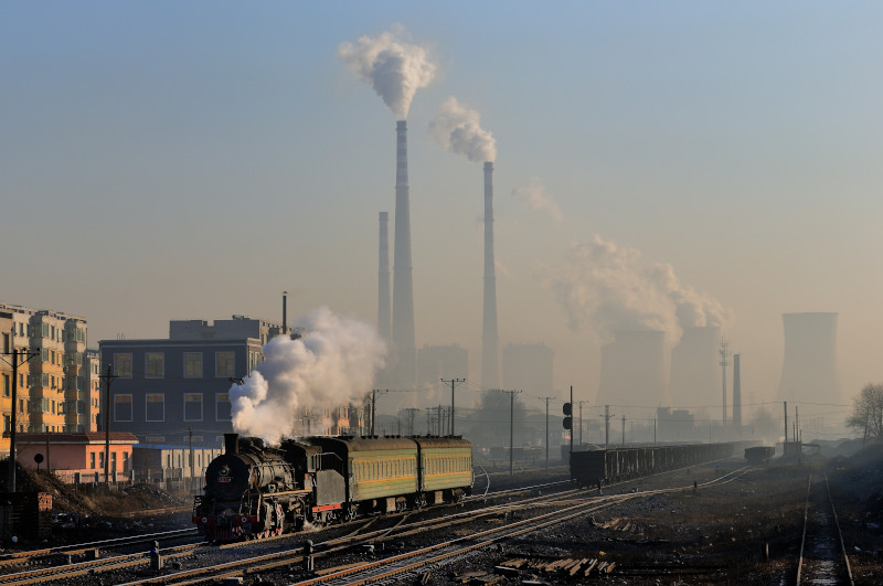 とにかく大気汚染がすさまじいです。背景の冷却塔と高い煙突は阜新市の石炭火力発電所です。