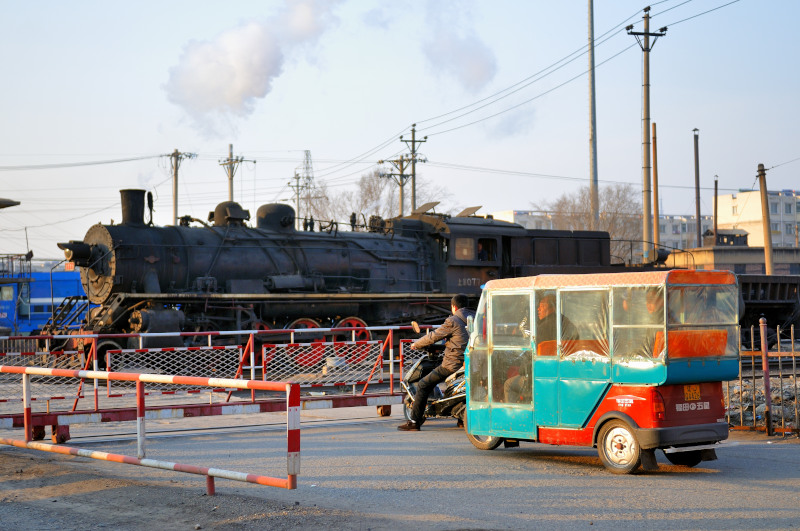 夕方、平安(Pingan)駅付近に移動です。踏切では、いろいろな車、バイク、自転車、人が行き