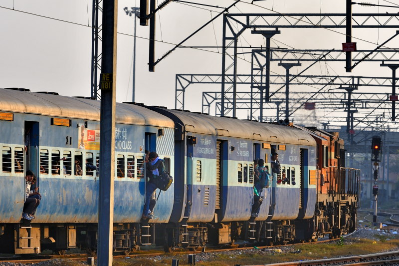 乗客はデッキにぶら下がっています。インドのいつもの光景です。