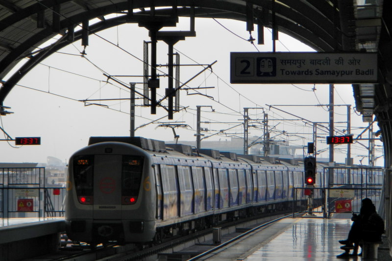 Delhiのメトロ。市街地は地下鉄で郊外では高架鉄道です。扉を閉めた状態で走ります。