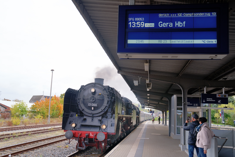 しかし、直前入手のダイヤでは機関車は01 509と01 066との重連で、Saalfeldから路線が変更となり