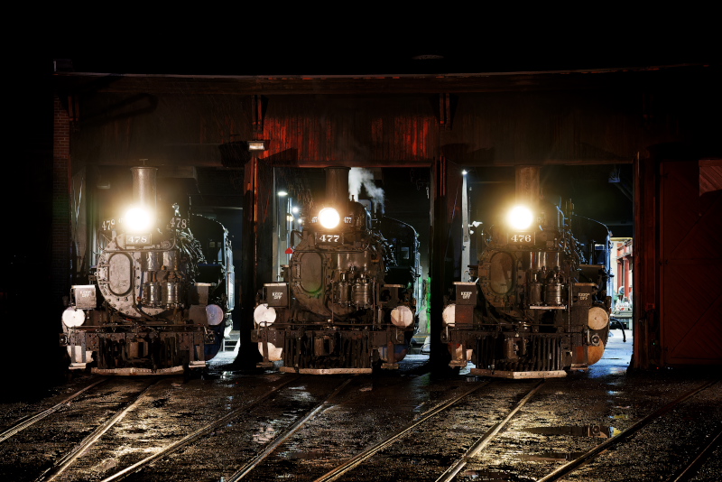 夜20時からDurango機関庫前で夜間撮影。476、477、478号機が機関庫に並んだ。いずれも